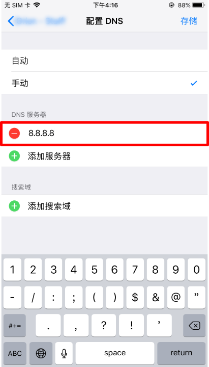 接下来在弹出的键盘上输入你需要改动的DNS数据,本例子中我们使用Google提供的8.8.8.8