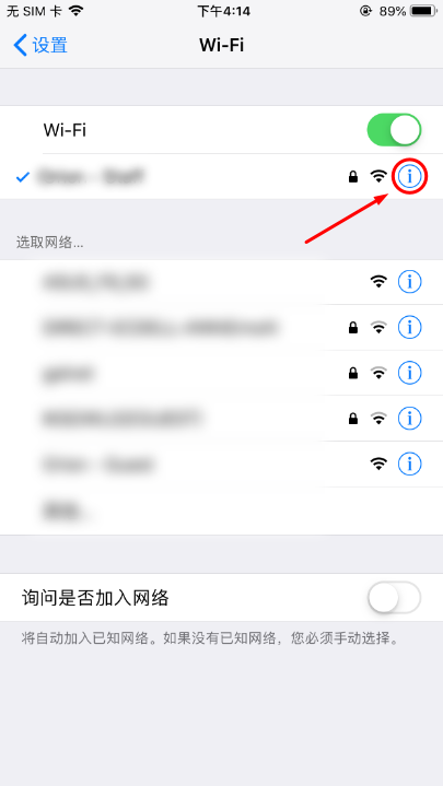 连接上可用的Wi-Fi网络后,然后点击Wi-Fi网给名称右方的【显示信息】按钮【字母i】
